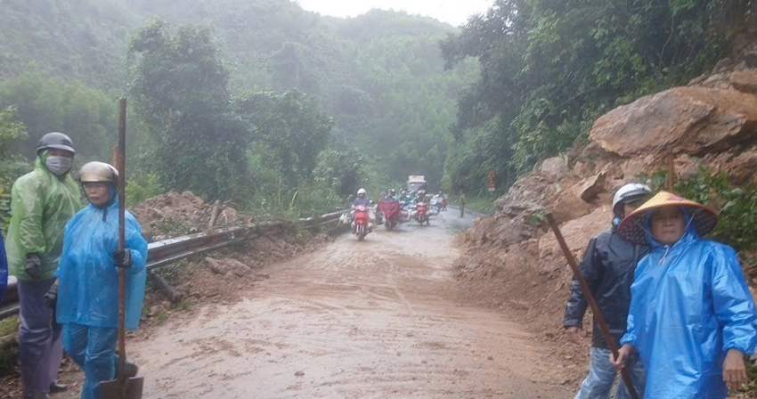 Theo Công ty cổ phần Quản lý và Xây dựng Đường bộ Thừa Thiên Huế, mưa lớn thời gian qua đã làm khối lượng đất đá lớn sạt trượt từ trên đồi tràn ra mặt đường Hồ Chí Minh tại vị trí Km317+150 thuộc tuyến đèo Pê Ke, gây ách tắc giao thông.