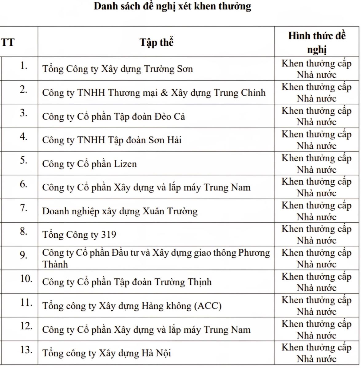 Để có thông tin trước khi trình Hội đồng Thi đua - Khen thưởng Bộ xem xét khen thưởng, Bộ Xây dựng đăng tải công khai lên Cổng Thông tin điện tử Bộ Xây dựng để lấy ý kiến xét khen thưởng cấp Nhà nước cho các tập thể có thành tích xuất sắc trong các phong trào thi đua (“đợt thi đua cao điểm “500 ngày đêm thi đua hoàn thành 3.000km đường bộ cao tốc”; đẩy mạnh tiến độ thực hiện, giải ngân kế hoạch vốn đầu tư công” giai đoạn 2021-2025”; “Đẩy mạnh kết cấu hạ tầng giao thông đồng bộ, hiện đại; thực hành tiết kiệm, chống lãng phí”) (có danh sách kèm theo).
