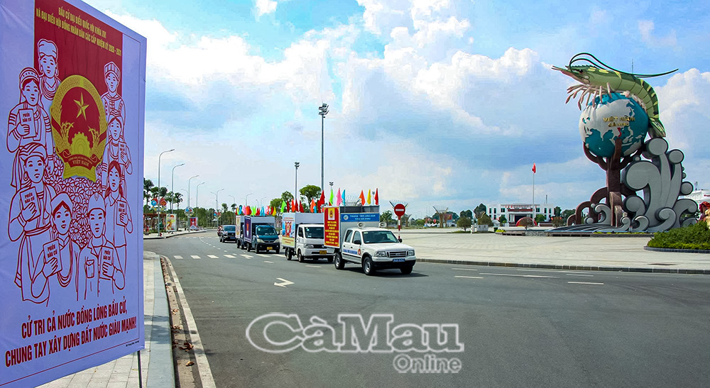 Công tác tuyên truyền lưu động về bầu cử diễn ra thường xuyên, liên tục. (Ảnh chụp tại khu vực Quảng trường Phan Ngọc Hiển, phường An Xuyên).
