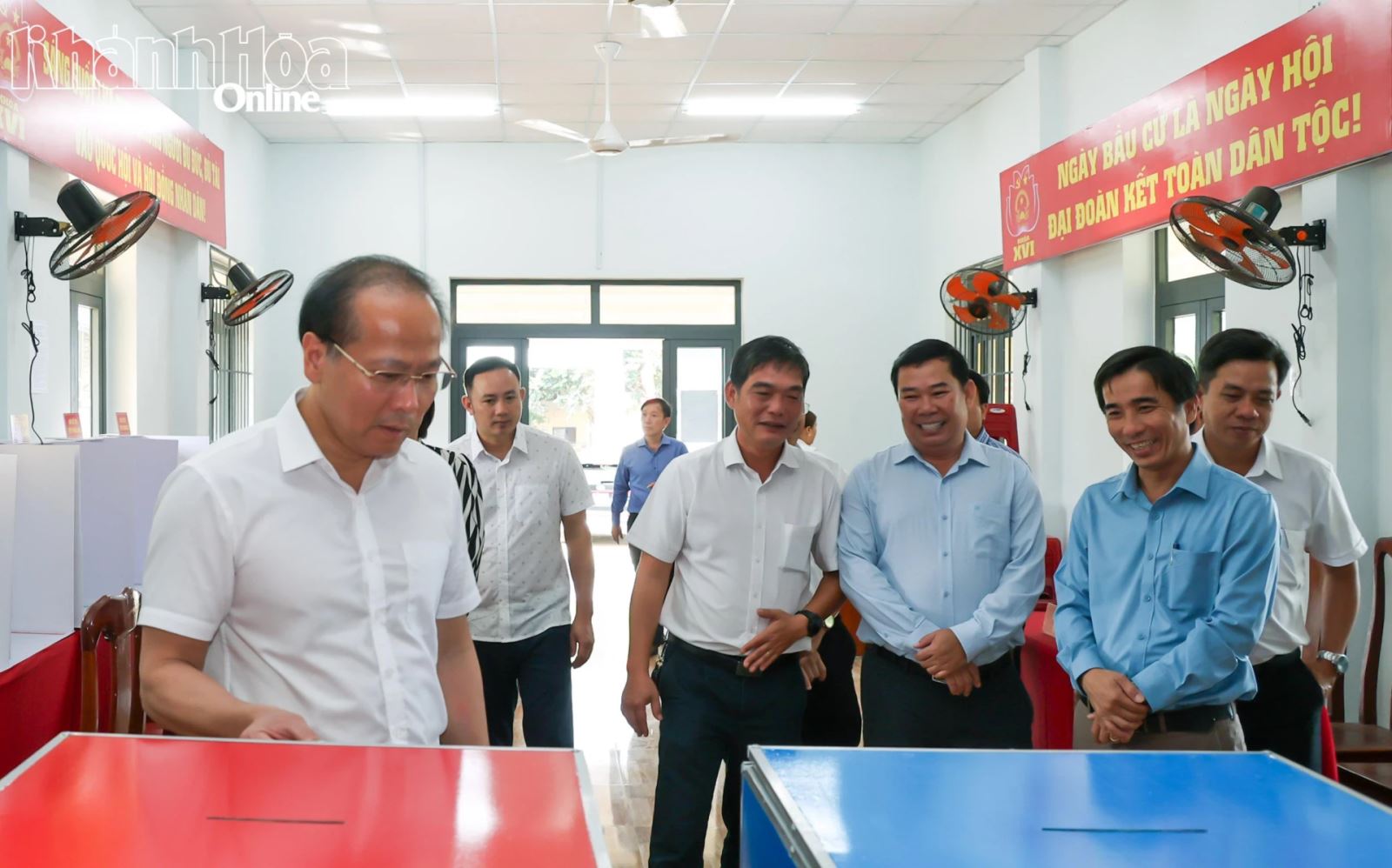 Đồng chí Nguyễn Khắc Hà kiểm tra việc bố trí các hòm phiếu tại khu vực bỏ phiếu ở xã Suối Dầu