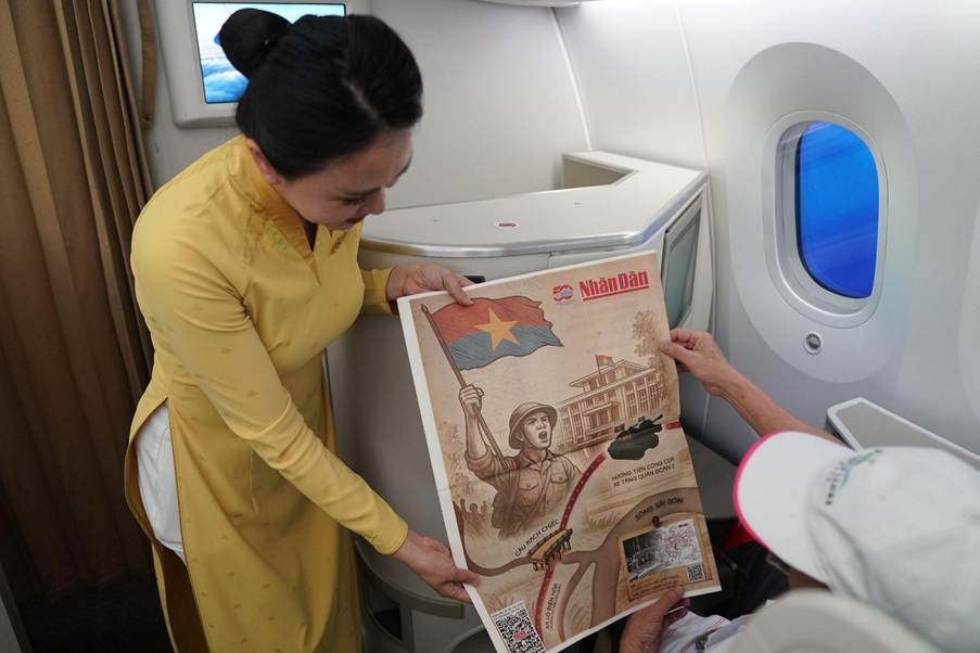 Hành khách trên chuyến bay bất ngờ nhận được món quà ý nghĩa từ Vietnam Airlines - tờ phụ san đặc biệt của báo Nhân Dân về sự kiện 30/4