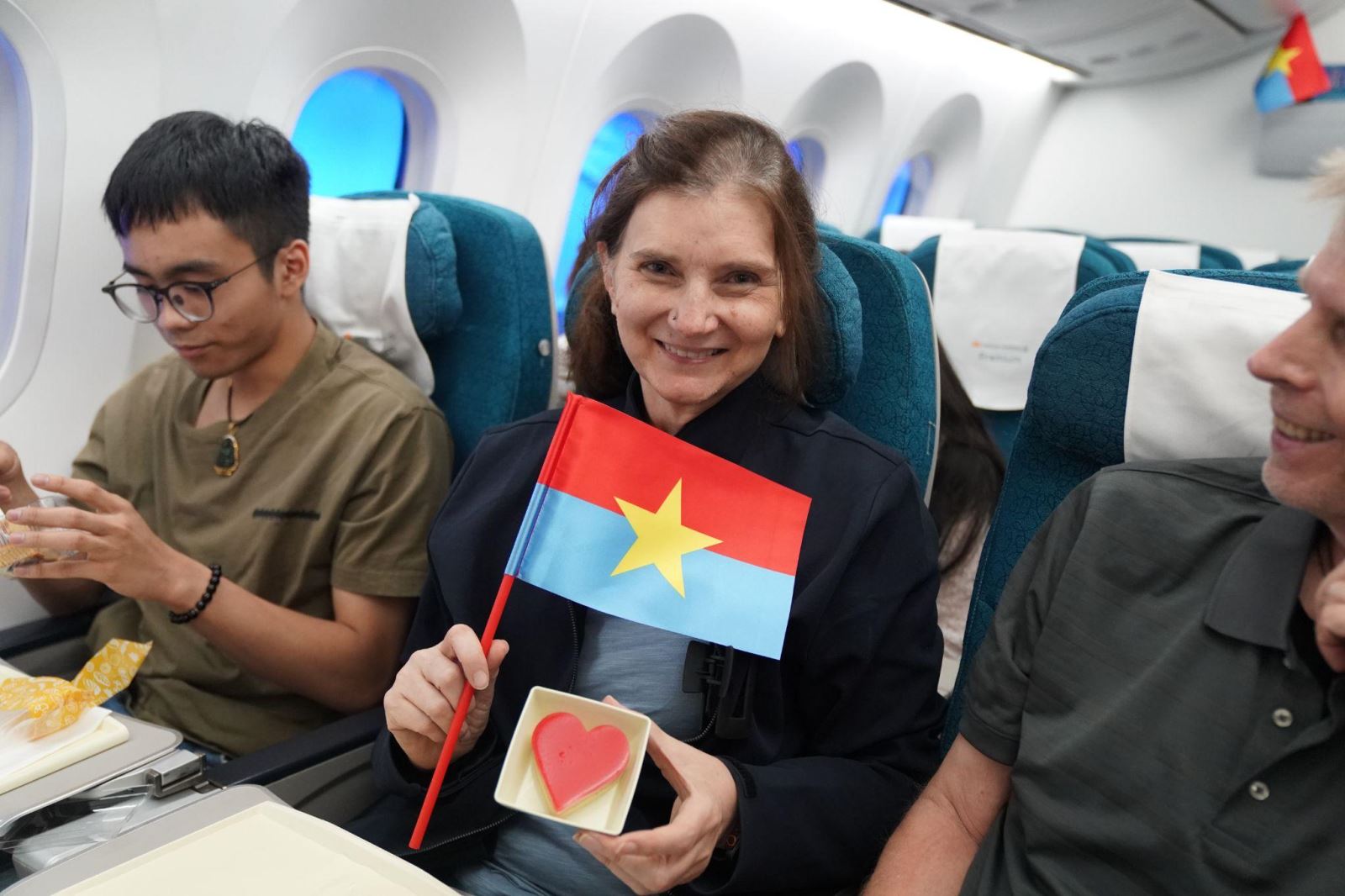 Tất cả hành khách cùng phi hành đoàn vẫy cao lá cờ đỏ sao vàng, hòa mình vào giai điệu bài hát “Như có Bác trong ngày đại thắng”, tạo nên không khí rộn ràng và phấn khởi