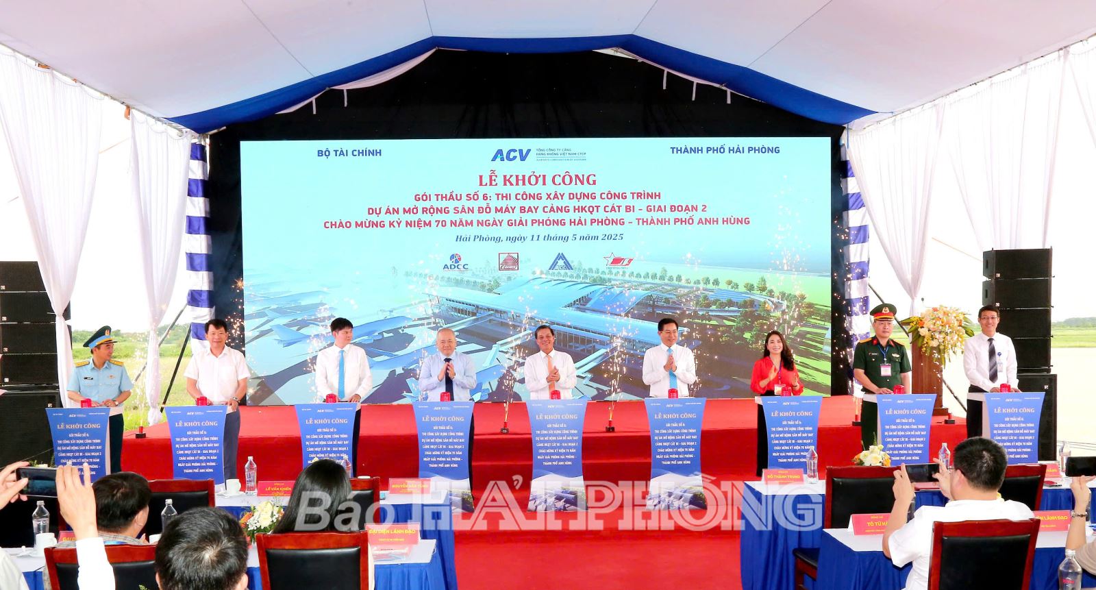 Các đồng chí Đỗ Thành Trung, Thứ trưởng Bộ Tài chính; Nguyễn Văn Tùng, Chủ tịch UBND thành phố cùng đại diện các Ban, ngành nhấn nút khởi công dự án Cảng hàng không Quốc tế Cát Bi giai đoạn 2.
