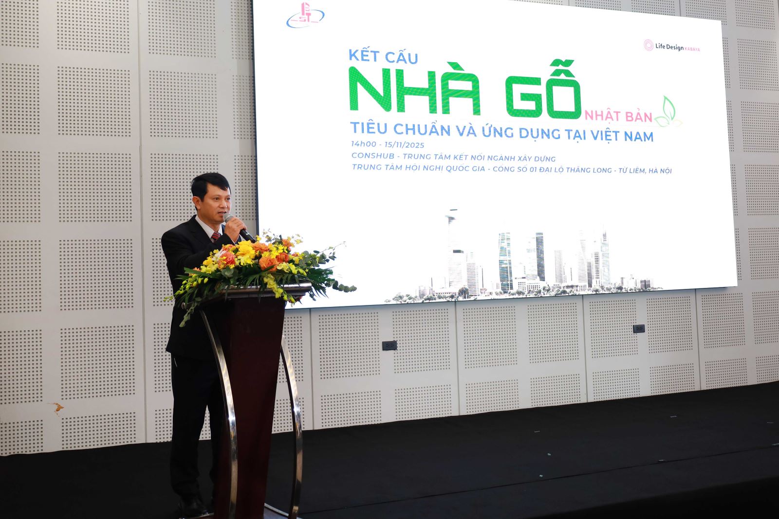 Tại hội thảo, GS. Fukumoto Koji - Trường Đại học Kindai (Nhật Bản) chia sẻ toàn cảnh về kiến trúc và công nghệ nhà gỗ Nhật Bản, từ lịch sử phát triển hàng trăm năm đến các công nghệ hiện đại dựa trên gỗ kỹ thuật; đông thời cho biết, Nhật Bản coi gỗ là “vật liệu của tương lai” nhờ khả năng lưu trữ carbon, trọng lượng nhẹ nhưng vẫn đảm bảo yêu cầu cơ học cao, giảm năng lượng tiêu hao trong thi công, đồng thời mang lại không gian sống tự nhiên, lành mạnh. Những mô hình công trình gỗ cao tầng, trung tâm thương mại, trường học, nhà ở cộng đồng… đã chứng minh hiệu quả vượt trội và khả năng nhân rộng.