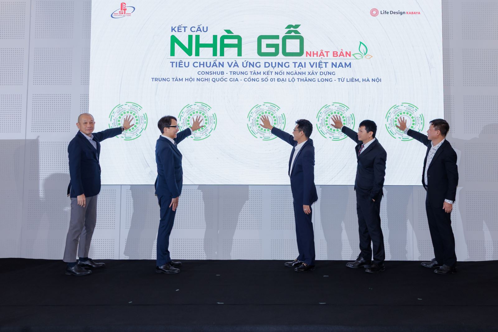 Viện trưởng Nguyễn Hồng Hải, Chủ tịch Công ty Life Design Kabaya và các đại biểu thực hiện nghi thức công bố 5 Tiêu chuẩn cơ sở về vật liệu và kết cấu nhà gỗ