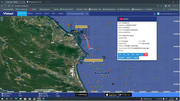 Tại hiện trường, Trung tâm đã huy động 07 tàu tham gia tìm kiếm gồm: SAR 631, Thiên Tài 669, Thiên Tài 669, Thiên Tài 86, Hải Vân, Phong Nha 01, CSB 1011), do tàu SAR 631 là chỉ huy hiện trường tìm kiếm các thuyền viên mất tích.