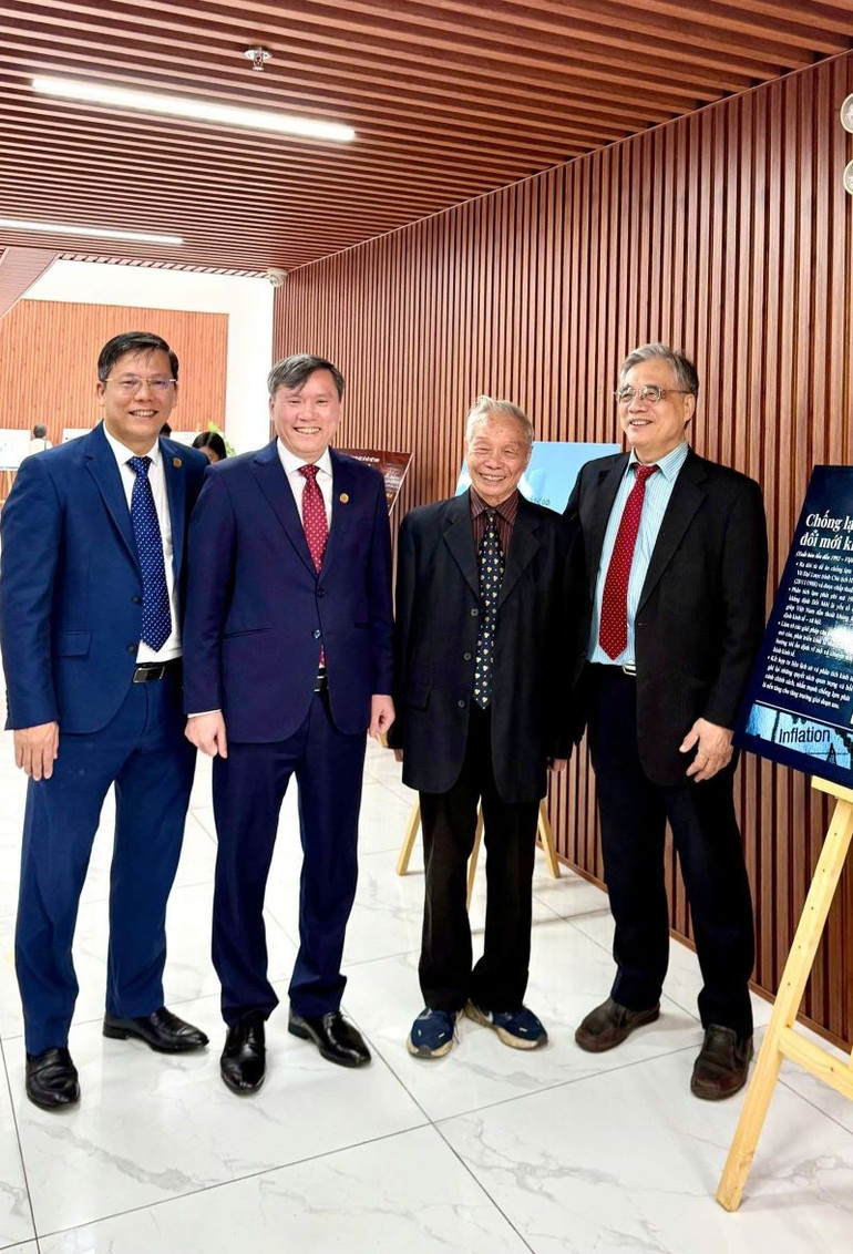 Giáo sư, Tiến sĩ Lê Văn Lợi, Chủ tịch Viện Hàn lâm Khoa học xã hội Việt Nam chụp ảnh lưu niệm cùng các nhà khoa học tại không gian trưng bày.