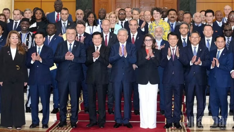 Tổng Bí thư Tô Lâm với Trưởng đoàn các nước tham dự Lễ mở ký Công ước Hà Nội. (Ảnh: ĐĂNG KHOA)